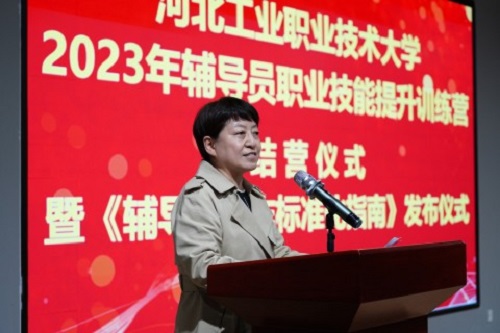 结营仪式上,党委副书记付俊薇、院系书记代表以及辅导员代表共同按下象征发布的按钮,我校《辅导员工作标准化指南》正式发布。付俊薇在仪式上讲话,她首先肯定了本次训练营取得的成效,指出《辅导员工作标准化指南》的发布对于我校学生管理和思想政治工作具有重要意义。围绕学校思政工作和辅导员的个人成长,付俊薇向全体学工队伍提出了三点希望。一是要学习二十大精神,坚持立德树人,体现工职大学工人的家国情怀。二是要深入调查研究,直面工作的痛点难点,体现工职大学工人的工匠精神。三是要凝练经验做法,进行项目化研究,体现工职大学工人的职业素养。
