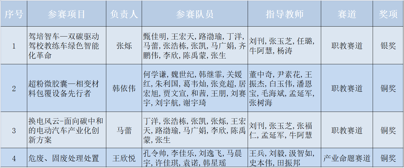 2023年2月20日中国国际“互联网+”大学生创新创业大赛组织委员会对第八届中国国际“互联网+”大学生创新创业大赛大赛获奖名单进行了公示,我校汽车工程系“驾培智车—双碳驱动驾校教练车绿色智能化革命”项目荣获职教赛道国赛银奖。材料工程系“超粉微胶囊--相变材料包覆设备先行者”项目,汽车工程系“换电风云”项目,环境与化学工程系“危废、固废处理处置”项目均斩获国赛铜奖。