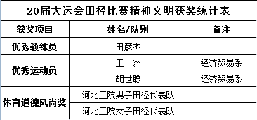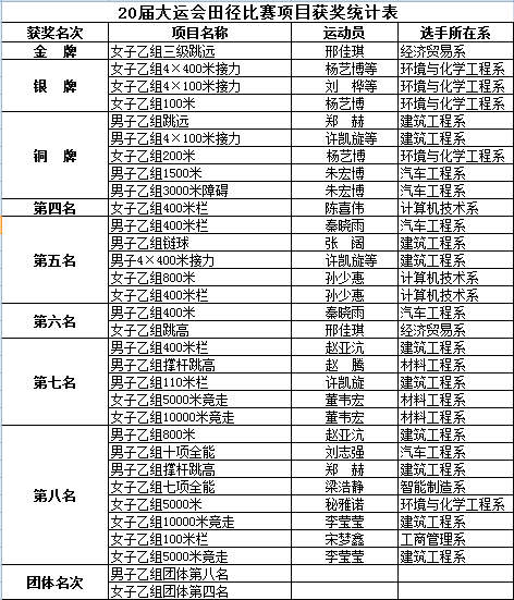 7月12日至16日,我院选派20名运动员参加河北省第二十届大学生运动会,队员们齐心协力,力排酷暑和伤病,努力拼搏,在这次比赛中完美诠释了更高、更快、更强的体育精神,在赛场上为河北工业职业技术学院争光添彩。经过五天的激烈角逐,我院运动健儿共获金牌1枚、银牌3枚、铜牌5枚、第四名1个、第五名5个、第六名2个、第七名5个、第八名8个,女子团体总分名列第四,男子团体总分名列第八,男、女子田径代表队分获第二十届大运会“体育道德风尚奖”, 田彦杰老师获得优秀教练员荣誉称号,实现了运动成绩和精神文明的双丰收。