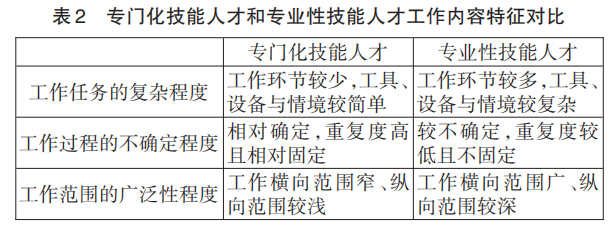 以对该专业实证材料的基本分析为基础,结合职业教育工作任务分析的一般维度,可以从工作任务的复杂程度、工作过程的不确定程度、工作范围的广泛性程度这几个方面来分析专门化技能人才和专业性技能人才工作内容的主要特征,进而以此作为职业专科教育与职业本科教育课程内容设计的基本依据,具体见表2。
