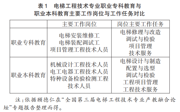 若要在办学上实现职业专科教育与职业本科教育的错位布局,关键抓手是分析二者培养内容即课程内容的不同,也就是要进一步具体分析专门化技能人才与专业性技能人才这两类人才的知识与能力结构。而分析技能人才知识与能力结构的基本方法是分析他们具体的工作内容,即通过对比职业专科教育与职业本科教育对应的岗位以及岗位主要工作任务,来分析二者课程内容的不同。岗位是现代企业基于分工理念的一种生产组织模式下的产物,其最大特征是岗位与岗位之间是有较为清晰的工作任务区分。通过分析职业专科教育与职业本科教育对应岗位的不同,可以为二者课程内容的设计提供最基本的依据;岗位工作任务则是职业教育课程内容的直接来源,分析二者对应岗位的工作任务可以为课程内容的设计提供直接的依据。下面以职业教育装备制造大类专业中的电梯工程技术专业为例,分析该专业在职业专科教育和职业本科教育中对应岗位以及主要工作任务的不同,这一专业在制造业中具有一定的代表性,因而分析结果对职业教育其他专业人才培养也具有借鉴意义。具体见表1。