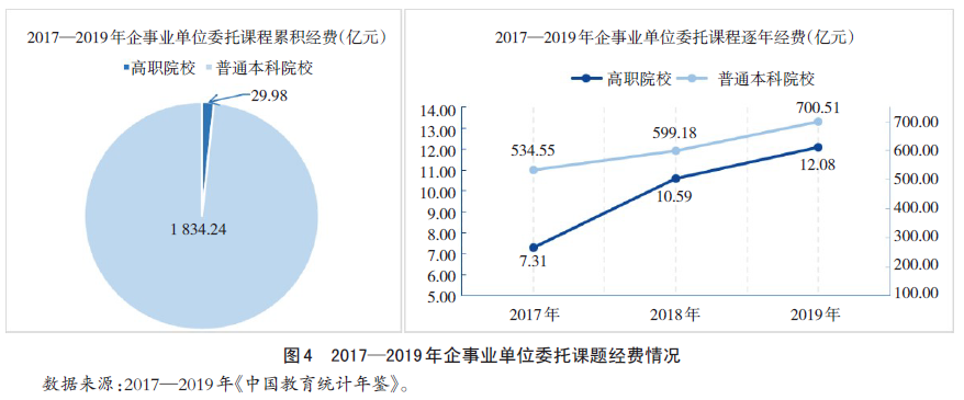 从企事业单位委托课题经费看,高职院校承担委托课题经费从2017年的7.31亿元增长至2019年的12.08亿元,累积经费29.98亿元,远低于普通本科院校承担的课题累积经费1834.24亿元(图4)。这说明,社会对高职院校科研的认可程度不高,高职院校科研服务社会的能力有待提高。