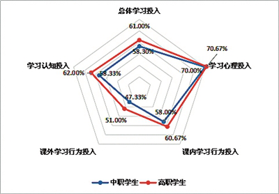 3.多数学生能反思并改进学习,深层认知相对不足。学习认知是学生学习过程中表现出来的信息加工方式,反映的是学生理解复杂概念或掌握较高难度技能所要付出的必要努力,良好的认知策略有利于学生提高学习效果和效率。调查结果显示,多数学生能有效运用元认知策略,60.1%的中职学生和66.2%的高职学生反映能够积极反思并改进自己的学习过程。但学生深层认知相对不足,只有部分学生能有效运用深层认知策略。例如,在学习时能够综合不同课程视角、包容不同观点、整合不同来源信息的中职学生分别占46.3%、51.1%、48.2%,高职学生则分别占53.2%、59.9%、57.6%。