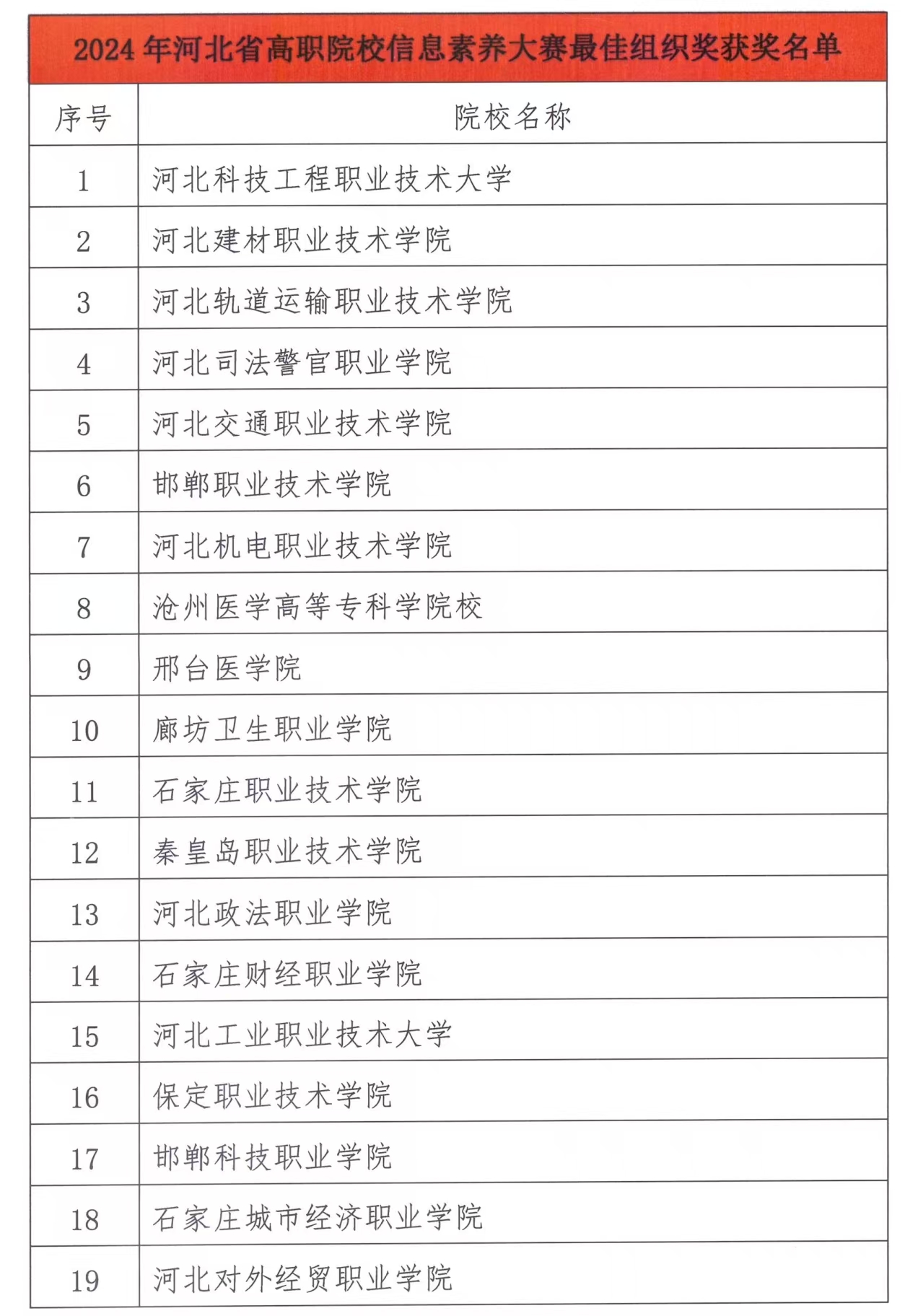 在刚刚落幕的河北省高职院校信息素养大赛中,我校师生表现出色,荣获省级一等奖1项,二等奖5项、三等奖5项。其中,2名教师和2名学生分别成功晋级国赛。我校荣获2024年河北省高职院校信息素养大赛最佳组织奖。