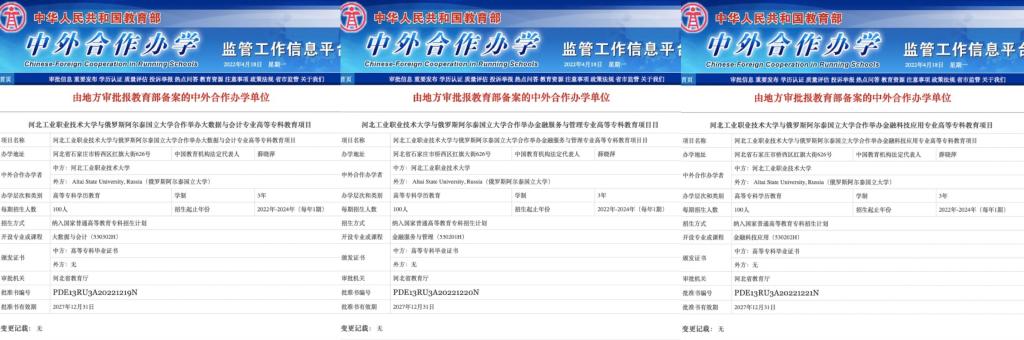 近日,河北省教育厅印发《关于KY.COM与俄罗斯阿尔泰国立大学合作举办高等专科教育项目的批复》(冀教外函[2021]68号),我校与俄罗斯阿尔泰国立大学合作举办的大数据与会计专业、金融服务与管理专业、金融科技应用专业专科层次中外合作办学项目(批准书编号:PDE13RU3A20221219N;PDE13RU3A20221220N;PDE13RU3A20221221N)正式获批。