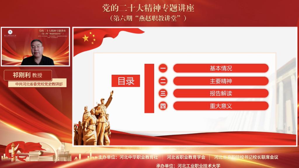 此次活动由河北中华职业教育社、省职业教育学会及省高职院校书记校长联席会议联合举办,旨在深入学习宣传贯彻党的二十大精神,助力党的二十大精神在我省职教战线落地见效。活动邀请中共河北省委党校党史教研部祁刚利教授主讲,采用线上线下相结合的方式举行,线上讲座由河北中华职业教育社秘书处处长刘永涛主持,河北中华职教社社员单位及全省部分中高职院校师生3600余人在线上参与活动。我校五楼报告厅设置分会场,我校党委副书记付俊薇出席,学校部分中层干部、思政课教师及专任教师集中收看了讲座。