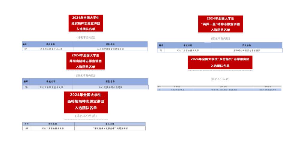学校团委积极响应号召,组织优秀学生干部、相关专业学生组建多类别宣讲团,围绕各个主题制定宣讲计划、认真准备宣讲内容、精心设计宣讲形式,经过校方推荐和主办方遴选,最终我校“红心向党颂延安”志愿宣讲团入选2024年全国大学生延安精神志愿宣讲团;“红心筑梦井冈山”志愿队入选全国大学生井冈山精神志愿宣讲团;“薪火相传 筑梦先锋”志愿服务团队入选2024年全国大学生西柏坡精神志愿宣讲团;“熠烨明灯铸强国”志愿宣讲团入选2024年全国大学生“两弹一星”精神志愿宣讲团;“弦歌不辍 薪火相传”志愿服务团入选2024年全国大学生“乡村振兴”志愿服务团。