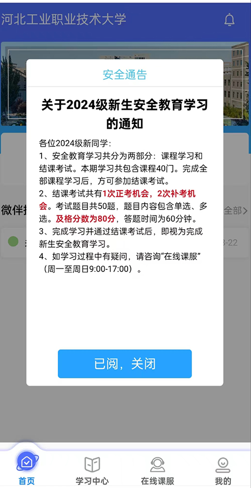 全员覆盖,精准触达,编织严密网络。在精心编制的《2024年新生入学手册》中,我校专门设置了关于安全教育学习的详细通知,与录取通知书精准送达每一位新生。此外,学校借助大数据实时掌握新生安全教育学习及考试情况,引导学生按时完成学习及考试任务,确保每一位新生都能参与到安全教育中来,覆盖率达100%,考试通过率达99.01%。