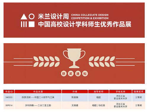 近日,“米兰设计周-中国高校设计学科师生优秀作品展”组委会公布第九届米兰设计周--中国高校设计学科师生优秀作品展评选结果,我校互联网学院电商专业美工实战班两件作品《四季流转——中国二十四节气之美》《岁时四象——二分二至之韵》,双双斩获“二十四节气文化作品设计大赛”全国三等奖。