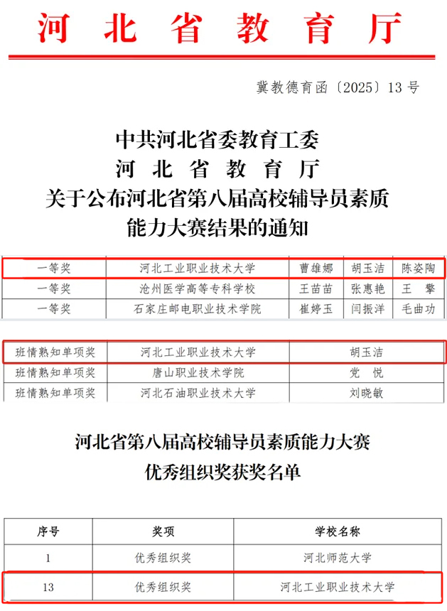在河北省第八届高校辅导员素质能力大赛中,我校辅导员团队荣获佳绩!由建筑工程学院曹雄娜、汽车工程学院胡玉洁、材料工程学院陈姿陶三位辅导员组成的参赛团队,在决赛(专科组)中勇夺团体一等奖!其中,胡玉洁荣获班情熟知项目单项奖,我校荣获优秀组织奖!
