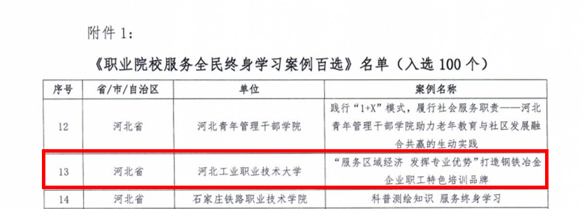 近日,中国成人教育协会公布了《职业院校服务全民终身学习案例百选》案例名单,我校申报的《“服务区域经济发挥专业优势”打造钢铁冶金企业职工特色培训品牌》案例成功入选。