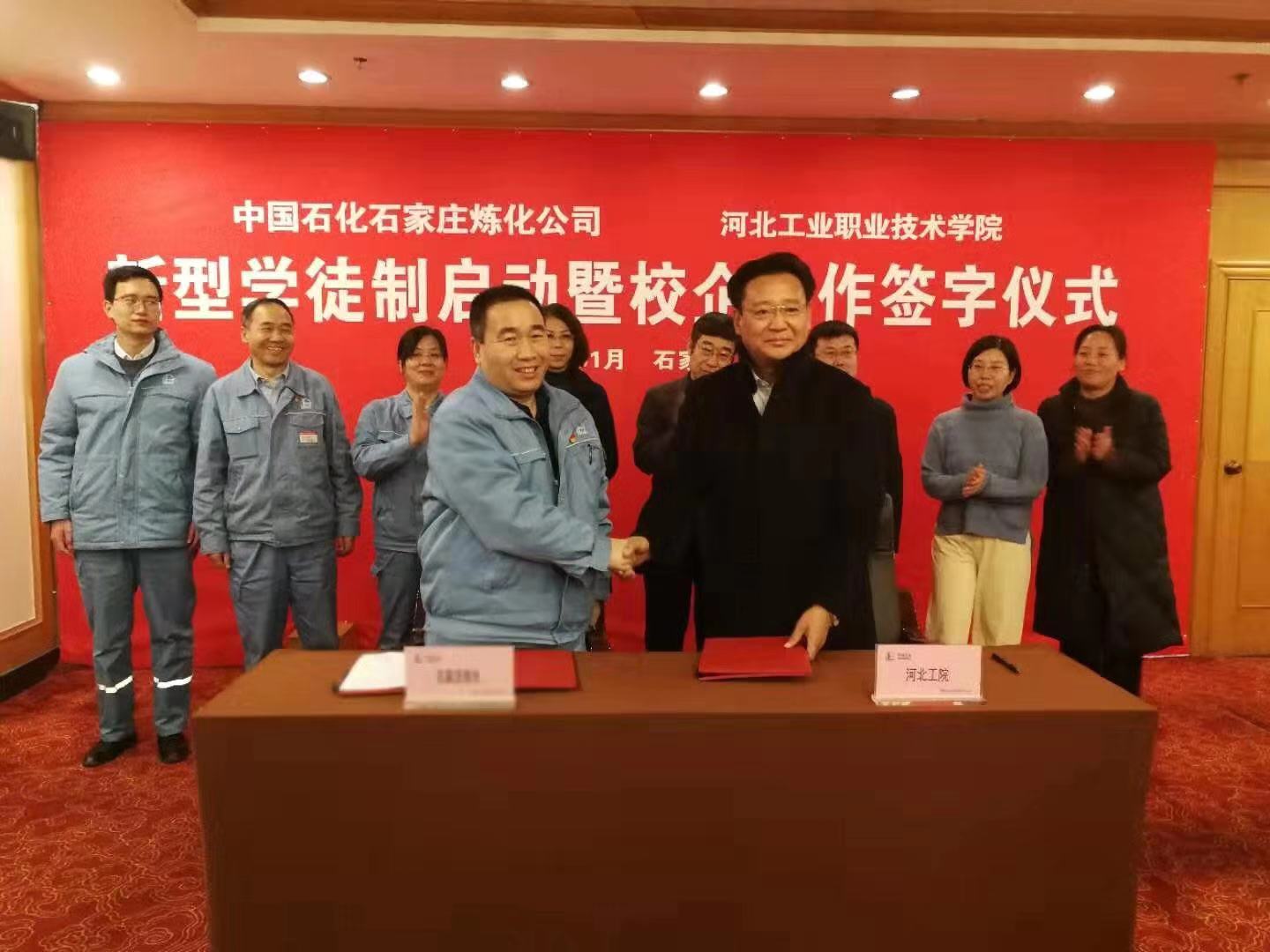 1月9日,中国石化石家庄炼化分公司与河北工业职业技术学院新型学徒制启动暨校企合作签约仪式在石炼化宾馆三楼会议室举行。我院院长贾俊礼、中国石化石家庄炼化分公司总工程师郝振岐、石家庄市循环化工园区社会发展局副局长樊振路、学院和石炼化相关部门负责人出席会议。