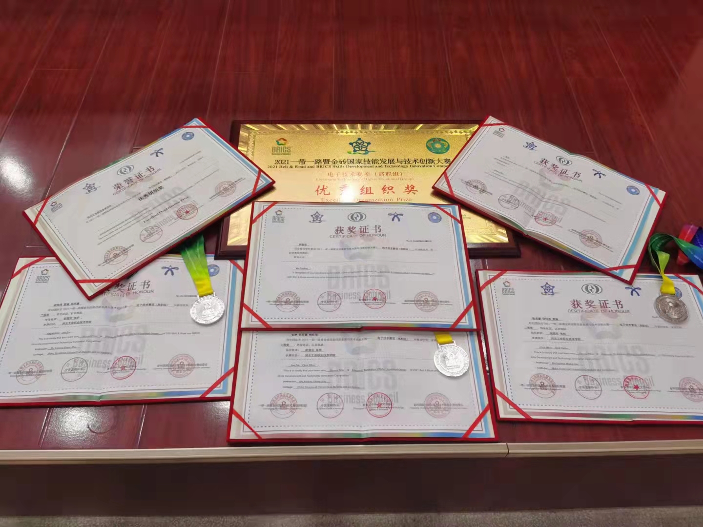 10月11日至10月13日,在由金砖国家工商理事会中方理事会和一带一路暨金砖国家技能发展国际联盟主办、中国发明协会和教育部中外人文交流中心联合主办的“2021一带一路暨金砖国家技能发展与技术创新大赛-电子技术大赛”国内决赛在枝江市职业教育中心成功举办。本次大赛的参赛队伍来自全国各地的29支高职院校参赛队和14支中职院校参赛队,共115名选手参加。经过激烈角逐,我校智能制造学院索琳、陈思豪和杨贵海三位同学荣获该赛项团体二等奖,我校荣获“电子技术”大赛“优秀组织奖”,胡雪花、张华两位老师被评选为“优秀指导教师”。