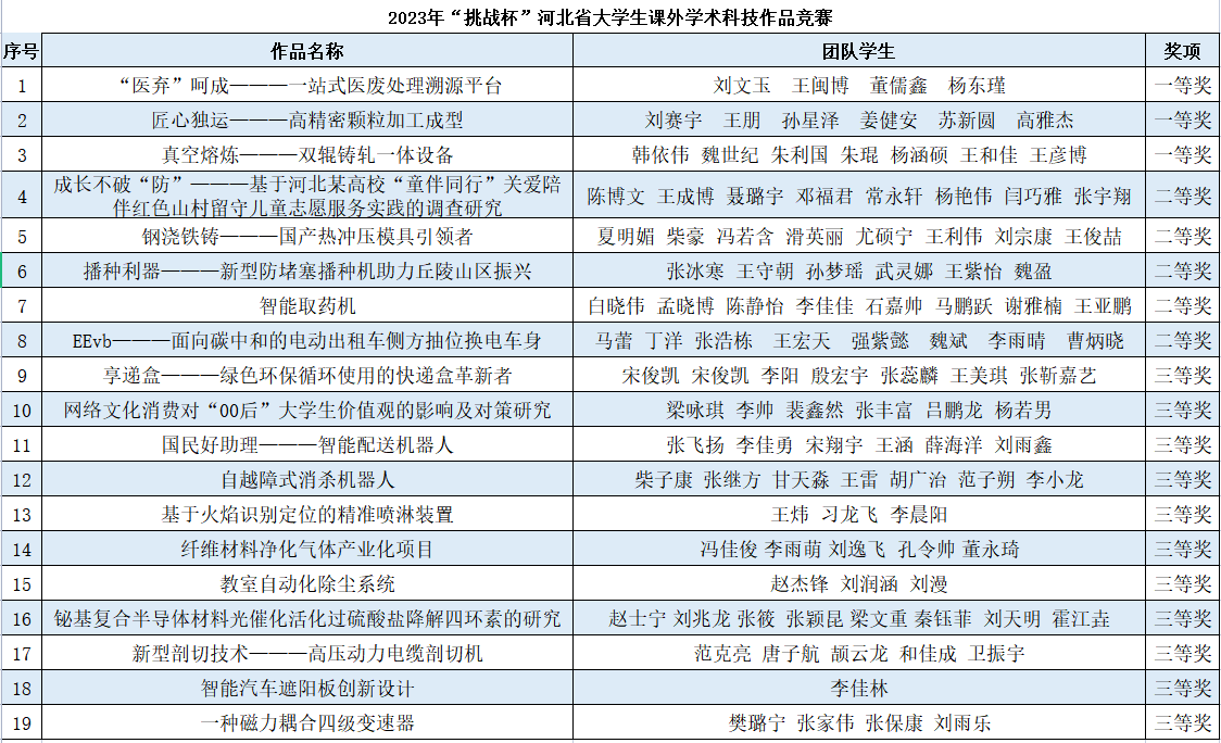 近日,2023年“挑战杯”河北省大学生课外学术科技作品竞赛落下帷幕,我校共有19项作品获奖,其中一等奖作品3项,二等奖作品5项,三等奖作品11项。