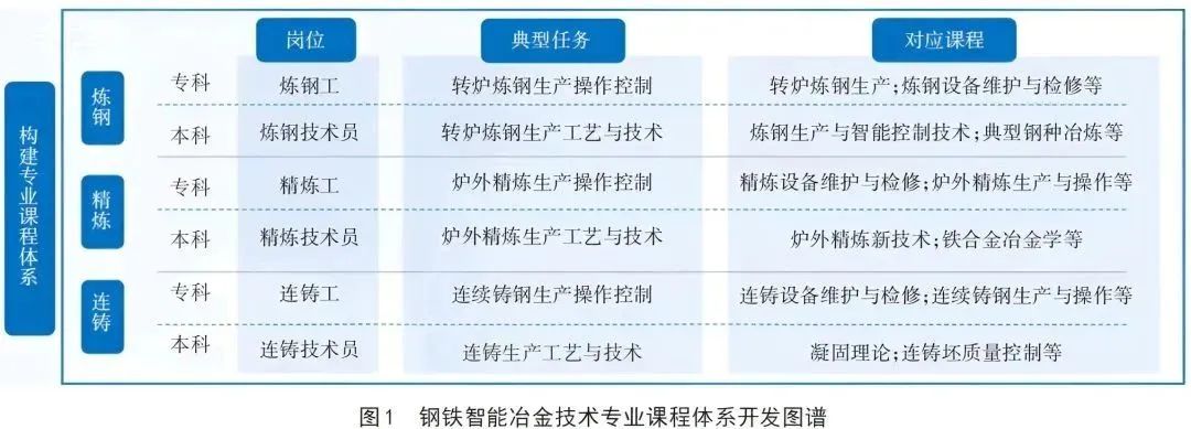 以钢铁智能冶金技术专业为例,展现学校构建的课程体系。河北省是钢铁大省,学校是冶金类特色学校,课程开发过程中,学校深入调研了包括河钢、宝钢等在内的钢铁冶金龙头企业,和企业一起确定专业对接的岗位,明确这些岗位中,专科应该干什么,本科应该干什么?最后形成对应课程。图1展现了从普通钢种的一线生产操作转向高品质特殊钢种的工艺设计及复杂生产操作,出现的工作任务与知识能力要求的递进。图2是对照岗位开发形成的新能源汽车工程技术专业完整的课程体系。