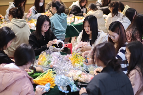 活动现场,同学们围坐一起,眼神专注,手指灵动,精心挑选心仪的花瓣、发箍等物料,仔细考量色彩的搭配,用心将一片片花瓣组合、固定在簪钗之上。制作过程中,大家轻声交流创意,虚心请教技巧,欢声笑语回荡在活动场地的每一个角落。当一支支饱含着巧思与创意的簪花制作完成,同学们迫不及待地将簪花簪于发间,纷纷拿起手机记录下美好的瞬间。活动现场氛围热烈而美好,吸引了众多学生纷至沓来,共赴这场春日的浪漫之约。