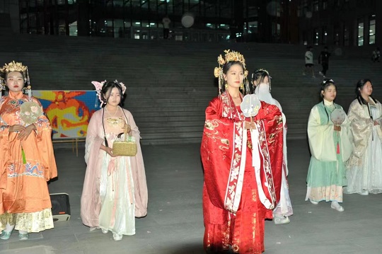 本次演出共设三幕。第一幕是“盛唐风韵”,表演者通过歌舞剧表演“盛唐夜唱”、汉服走秀展示等环节,展示了唐代时期的节日文化。第二幕是“大明风华”,社团成员们以歌舞剧“宝玉娶亲”的场景还原、诗词接龙飞花令的互动游戏,介绍了明朝时期的传统活动。第三幕是“衣冠尚国”,现场参与同学们一起进行了猜灯谜、传统文化知识抢答等游戏,激发了同学们学习我国传统文化知识的热情。