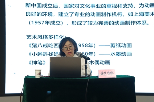 本次讲座,赵婷老师首先从中国动画萌芽期讲起,以珍贵的历史影像和生动故事,再现万氏兄弟等早期动画人突破技术困境,凭借《铁扇公主》等作品奠定民族动画风格基础的艰辛探索历程。接着在阐述“中国动画学派”黄金时代时,赵老师结合《大闹天宫》《小蝌蚪找妈妈》等经典动画片段,深入剖析水墨动画、戏曲元素与动画艺术的精妙融合,在国潮兴起的当下,这些经典作品所展现出的传统文化与动画技术碰撞产生的独特魅力,正是中国动画走向世界的底气所在,也是国潮文化在动画领域的精彩呈现。随后赵老师还特别介绍了2011年以来《哪吒之魔童降世》《长安三万里》等爆款作品的发布,这些作品巧妙地将国潮元素融入其中,从角色造型、场景设计到故事内涵,都蕴含着深厚的中国传统文化底蕴,见证了国漫在新国潮背景下的崛起之路。讲座结束后,赵老师耐心解答了同学们的问题,她鼓励大家:“要多了解中国动画的历史,从传统文化中汲取营养,讲好中国故事,共同推动中国动漫走向更广阔的舞台。”