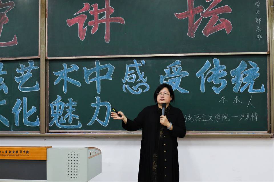 讲座中,尹老师首先以甲骨文为开端,带领我们追溯到几千年前。早在三皇五帝时期,人类就发明了甲骨文,这是迄今为止发现的最早的文字。接着,又讲述了字体的演变历程,从甲骨文到金文(大篆)、小篆、隶书、草书、楷书、行书等不同字体的起源、演进、发展和阶段特征,这为我国书法艺术的形成拉开了序幕。随着历史更迭,书法名人辈出,他们对书法艺术都有着独特的见解。宋徽宗创造了瘦金体;出身于书香门第却身世坎坷的郑板桥以画法书写了自己的精神追求;一代伟人毛泽东,豪气冲天、纵横驰骋的字体备受瞩目。改革开放后,全国掀起了“书法热”的浪潮,其中以启功先生最具代表性,形成了启功体书法。我国的汉字从商代发展到今天,已经走过了悠悠三千余年,形成了篆,隶,草,楷,行,五大字体,历朝历代的中国人把对美的追求注入到这五大字体之中,使得这五大字体有了生命和灵魂。最后,尹老师以“端端正正写字,堂堂正正做人”为结尾,使同学们领悟到书法艺术不但是一种美,更是一种可以见证人心性情的修为。