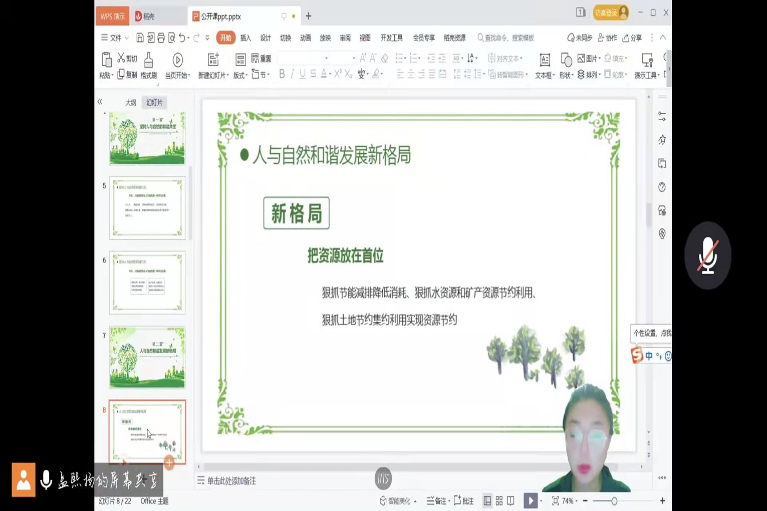 在本次讲座中,孟老师首先谈到了人的生存发展与大自然的密切关系,让同学们了解环境保护、垃圾分类知识,引导同学们绿色消费、低碳生活。接着她重点介绍了“人与自然和谐发展新格局”,提出在发展经济同时应优先保护生态环境,着力推进绿色发展,优化产业结构,减少对生态自然空间的占用。最后孟老师强调要进一步加快生态文明体制建设,要积极推进绿色发展、参与全球环境治理、多元化生态补偿机制、改革生态环境监管体制等具体措施。