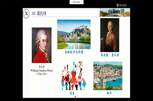 讲座中,胡老师对维也纳古典乐派进行了讲解。介绍了当代以海顿、莫扎特、贝多芬三位音乐家为代表的欧洲主流音乐流派,讲述了作为交响乐之父的海顿在弦乐四重奏中的创作形式和作品风格,以及贝多芬的作品包括9部交响曲、1部歌曲、32首钢琴奏鸣曲等多部作品。之后,胡老师为同学们重点讲述了“音乐天才”莫扎特的传奇一生,概述了他在35年短暂生命中创作的600余部不同体裁与形式的音乐作品,并在讲解中穿插播放了莫扎特的代表作品,展示了这位旷世奇人将人生苦难化为清新、明快、开朗音乐作品的创作历程。