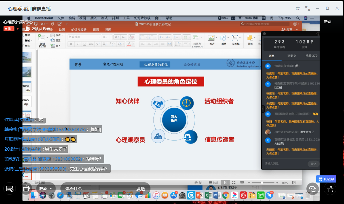 为进一步落实学院“三全育人”工作,强化心理育人工作力度,完善学校、院系、班级、宿舍“四级”预警防控体系,使新生班级心理委员更好地履行工作职责,我院对2020级327名心理委员进行了为期两周的培训。