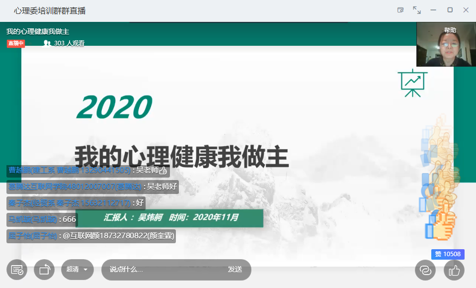 本次培训历经“缘聚你我 心晴绽放”团体活动、MOOC学习、“心理委员养成记”“我的心理健康我做主”专题讲座、心理助人技能实践教学、心理健康素养考试等环节,结合培训表现、出勤情况、考试成绩,共有322名同学通过考核,予以结业。这些心理委员将持证上岗,根据《心理委员工作手册》的相关要求,面向2020级同学普及心理知识,帮助同学们走出心理困惑,提升心理健康素养水平。
