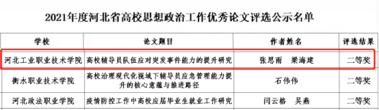 近日,由河北省学校德育工作中心、高校思想政治工作队伍培训研修中心组织的2021年度河北省高校思想政治工作优秀论文评选结果公示,我校互联网学院张思雨老师、梁海建老师撰写的论文《高校辅导员队伍应对突发事件能力的提升研究》和工商管理系何晓卉老师、赵娜老师撰写的论文《新时代视域下高校辅导员队伍素质能力提升策略研究》均获二等奖。