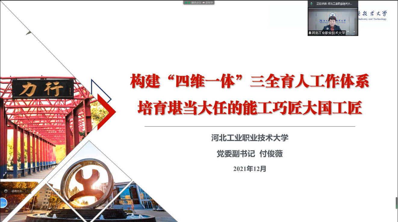 我校党委副书记付俊薇以“构建‘四维一体’三全育人工作体系,培育堪当大任的能工巧匠大国工匠”为题,从建设校企共同育人体、多元实施育人工程、建立全方位育人基地、构建全员评价考核体系四个方面发言交流。她指出学校认真贯彻落实习近平总书记对教育工作的重要指示,紧紧围绕立德树人根本任务,以育人队伍-育人工程-育人基地-育人评价为突破口,积极构建“四维一体”三全育人工作体系,全力推动了思想政治工作质量提升。