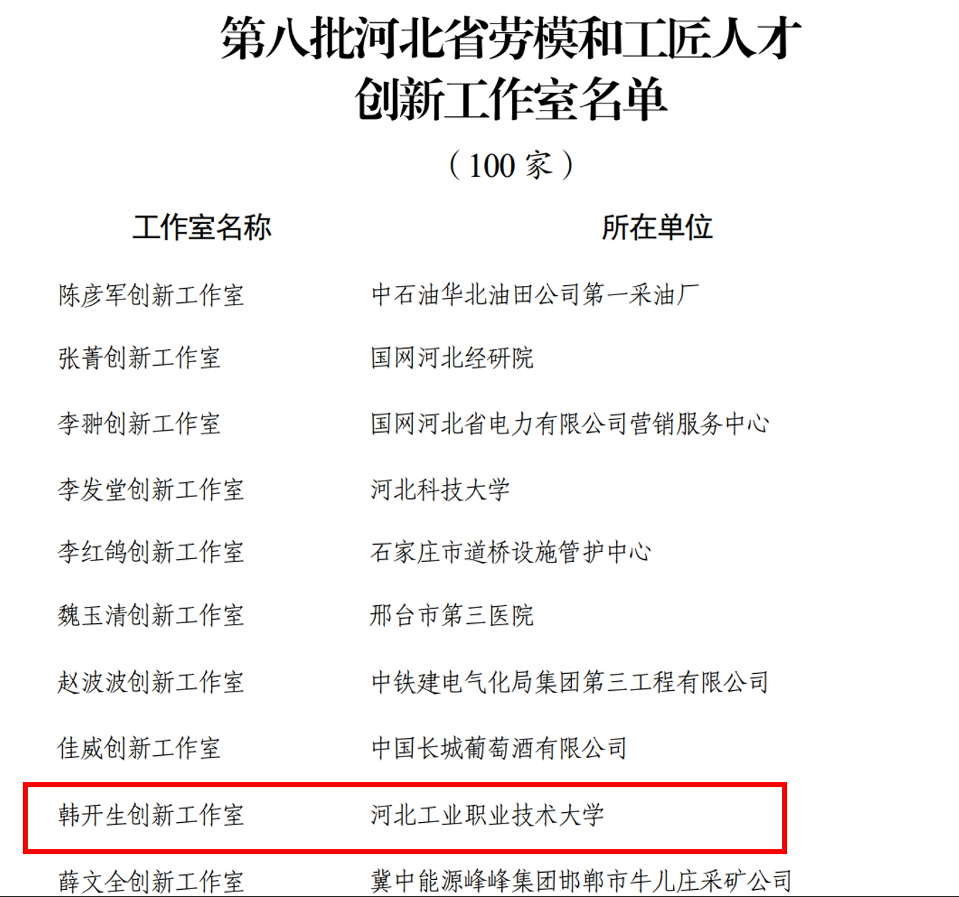 近日,河北省总工会、河北省科学技术厅联合下发了《关于命名第八批河北省劳模和工匠人才创新工作室的决定》,我校韩开生创新工作室被命名为第八批河北省级劳模和工匠人才创新工作室,排名第九(共100家)。工作室带头人韩开生副教授由省总工会授予“河北省五一劳动奖章”称号,韩开生创新工作室由省总工会授予“河北省工人先锋号”称号。